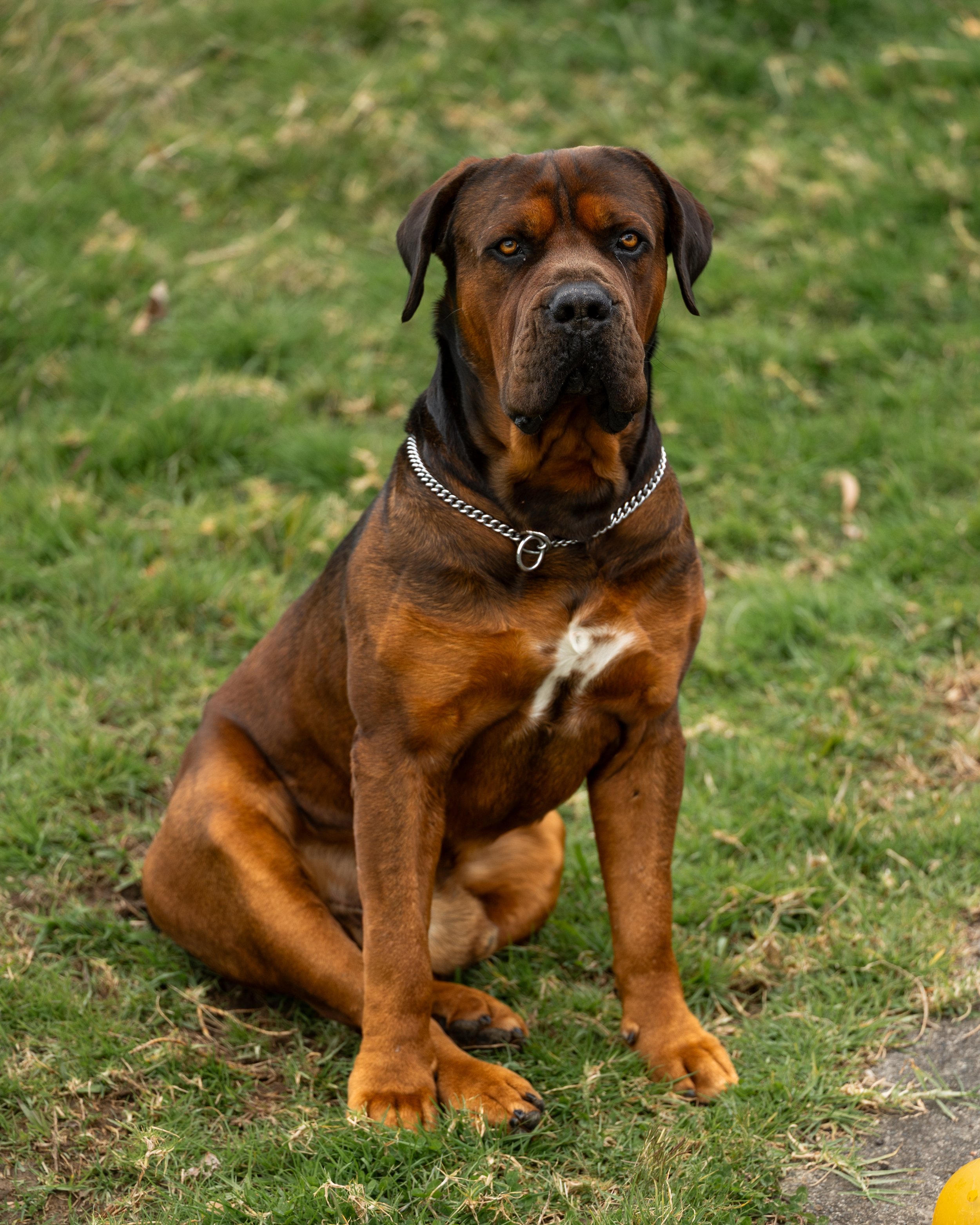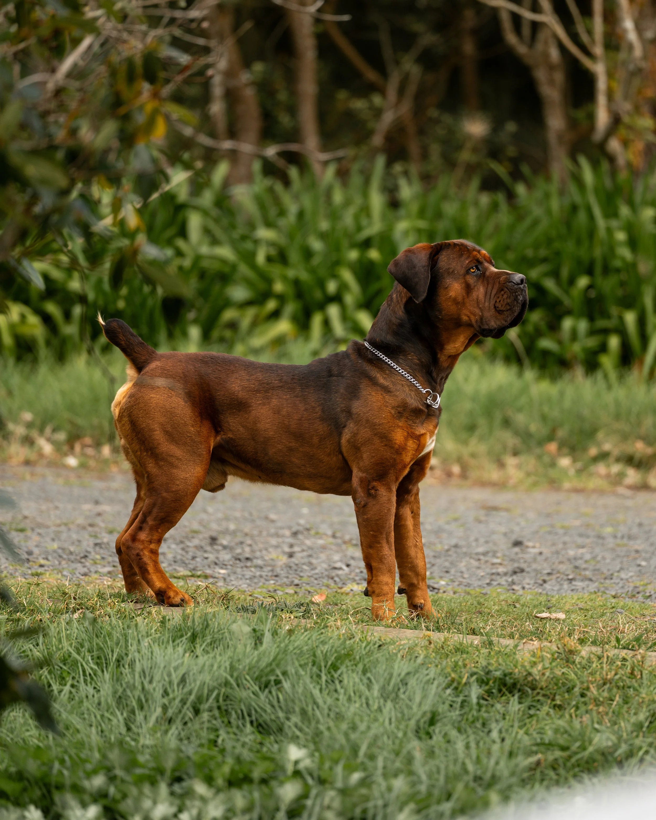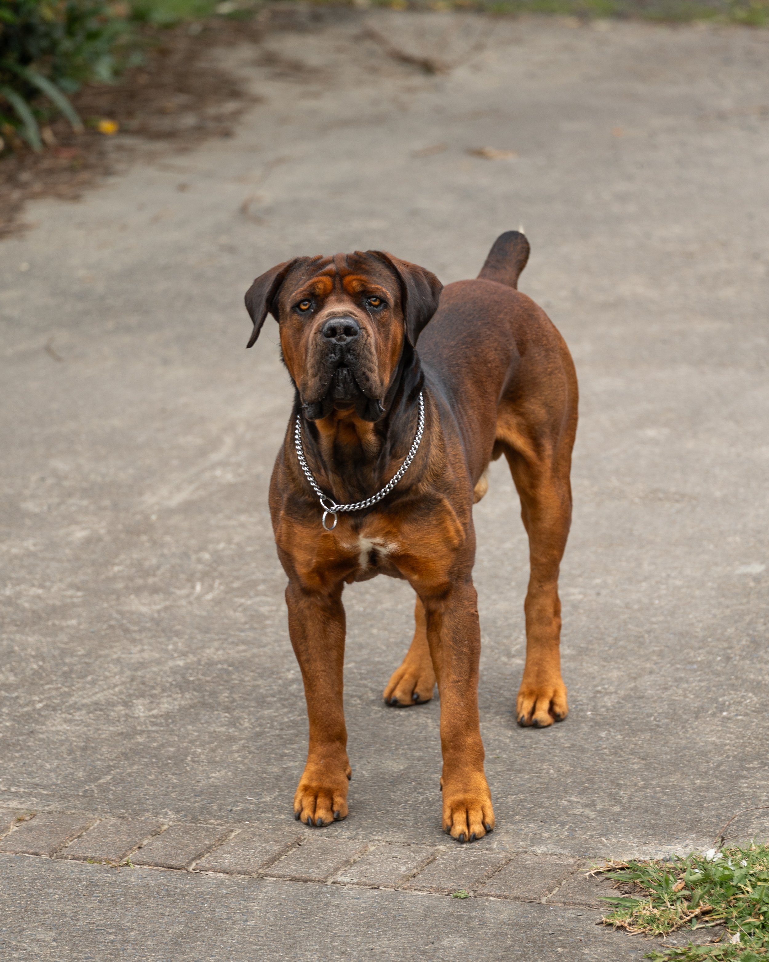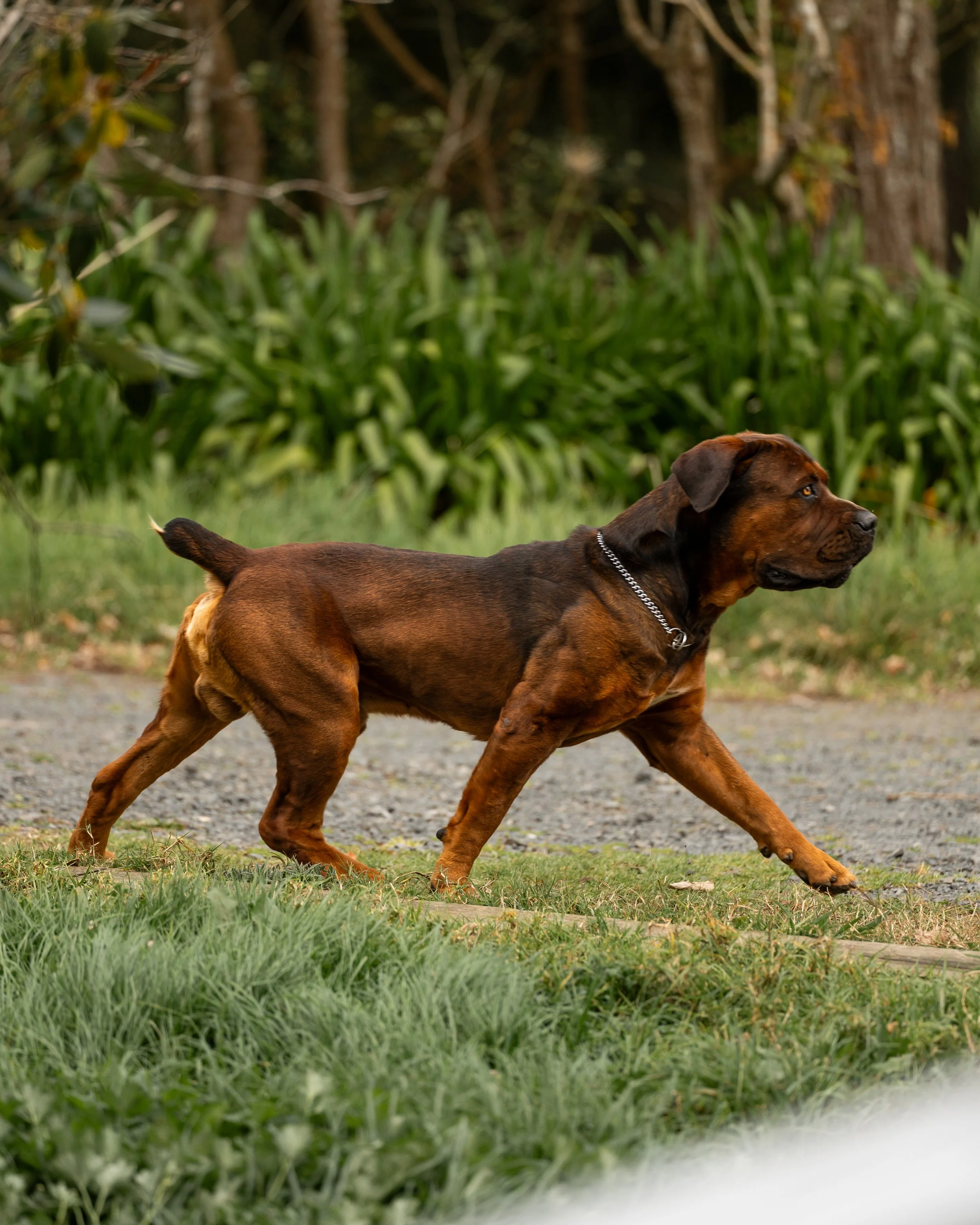 Zozo is the dog that started it all. All the way from Elite Guard Boerboels in Portugal, we waited far too long for him! But the moment he arrived, we knew he was worth every second. For the past four years, we've had the privilege of raising and living alongside this incredible boy. Zozo is a true guardian: protective, powerful, and deeply loyal. He has a natural presence that makes you feel safe, and his intelligence is matched by an emotional awareness that sets him apart. While he’s reactive and takes his role as protector seriously, he’s also gentle and affectionate with those he considers part of his pack. If you're not in the inner circle, Zozo’s not looking to make friends, but for his family, he’s all heart. With his stunning tri-colour coat, impressive agility, and solid obedience, he’s built like a brick and moves with purpose. Zozo is currently our only stud, and we are incredibly proud of our handsome boy. His lineage is as strong as his character, making him the perfect foundation for our Boerboel family.